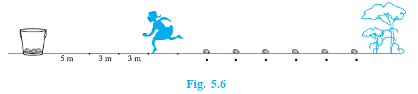 Download WorksheetIn a potato race, a bucket is placed at the starting point, which is 5 m from the first potato, and the other potatoes are placed 3 m apart in a straight line. There are ten potatoes in the line (see Fig. 5.6).