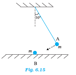 The bob $A$ of a pendulum released from $30^{\circ}$ to the vertical hits another bob $B$ of the same mass at rest on a table as shown in Fig. 6.15. How high does the bob $A$ rise after the collision ? Neglect the size of the bobs and assume the collision to be elastic.
