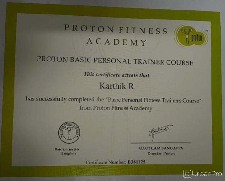 Karthik R describes himself as certified personal trainer (CPT) 14 YEARS OF TEACHING SKILLS IN MY FITNESS. He conducts classes in Personal Trainer. Karthik is located in Hebbal, Mysore. Karthik takes at students Home, Regular Classes- at his Home and Online Classes- via online medium. He has 14 years of teaching experience . HeĀ is well versed in English and Kannada.