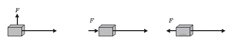 In each of the following a force, $F$ is acting on an object of mass, $m$. The direction of displacement is from west to east shown by the longer arrow. Observe the diagrams carefully and state whether the work done by the force is negative, positive or zero.