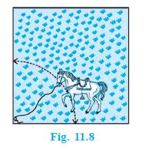 A horse is tied to a peg at one corner of a square shaped grass field of side 15 m by means of a 5 m long rope (see Fig. 11.8). Find (i) the area of that part of the field in which the horse can graze. (Use $\pi = 3.14$)