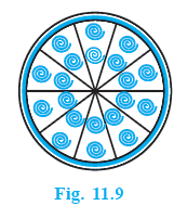 A brooch is made with silver wire in the form of a circle with diameter 35 mm. The wire is also used in making 5 diameters which divide the circle into 10 equal sectors as shown in Fig. 11.9. Find : (i) the total length of the silver wire required. (Unless stated otherwise, use $\pi = \frac{22}{7}$)