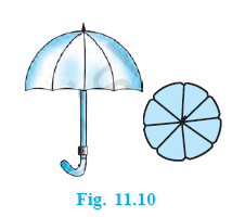 An umbrella has 8 ribs which are equally spaced (see Fig. 11.10). Assuming umbrella to be a flat circle of radius 45 cm, find the area between the two consecutive ribs of the umbrella. (Unless stated otherwise, use $\pi = \frac{22}{7}$)