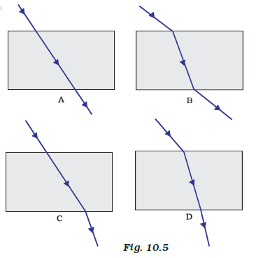 The path of a ray of light coming from air passing through a rectangular glass slab traced by four students are shown as $A$, $B$, $C$ and $D$ in Figure 10.5. Which one of them is correct?