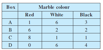 Suppose we have four boxes A,B,C and D containing coloured marbles as given below: